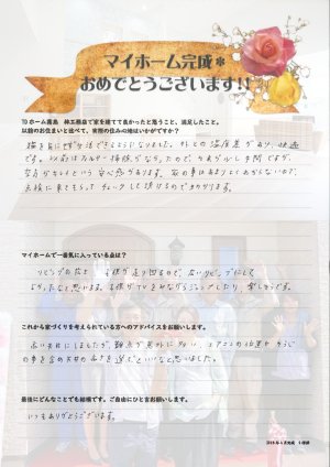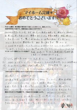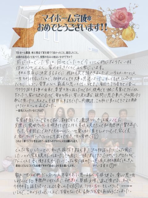 > あきらめないで良かったです。林工務店さんに思いきって電話をさせて頂いたことが、本当によかったと懐かしく思い出されます。家族で一緒になって家づくりをさせて頂いた事、こんなに幸せな事はありません。いつも寄り添って下さり、ありがとうございました。